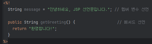<%! ... %> 내의 변수와 메소드는 JSP 서블릿 클래스의 멤버가 된다. 멤버 변수는 객체 생성 시 유지되며, 메소드를 정의해 동작을 작성할 수 있다. 화면에는 표현식을 사용해서 표시 할 수 있다.