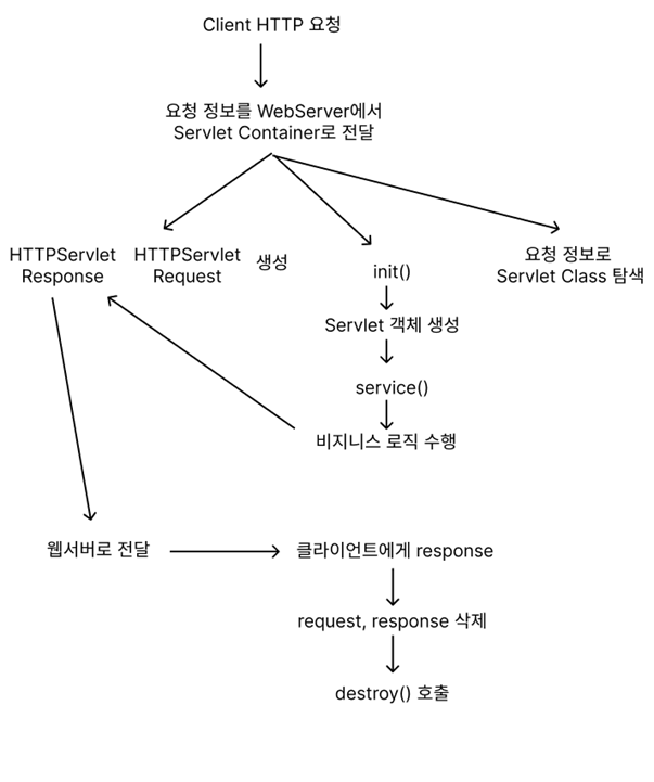 최초 “/hello” 요청이 들어오기전 컨테니어가 HelloServelt객체 생성. Init() 메소드 호출로 초기화 진행. 이어서 get()요청을 하면, service() 메소드 호출하여 내부적으로 HTTP 메소드에 맞는 doGet()실행 -> doGet() 메소드에서 HTTP 응답 작성 후 클라이언트에게 전달 -> 컨테이너가 더 이상 서블릿을 필요로하지않거나 서버가 종료 될 때 destroy() 메소드 호출 후 자원해제.
