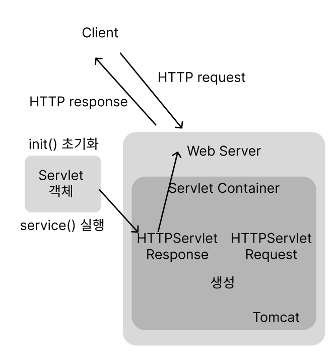 클라이언트가 “/hello” URL로 HTTP GET 요청을 보내면 서블릿 컨테이너가 이 요청을 감지 -> 컨테이너 요청에 매핑된 HelloServlet은 인스턴스 doGet() 호출