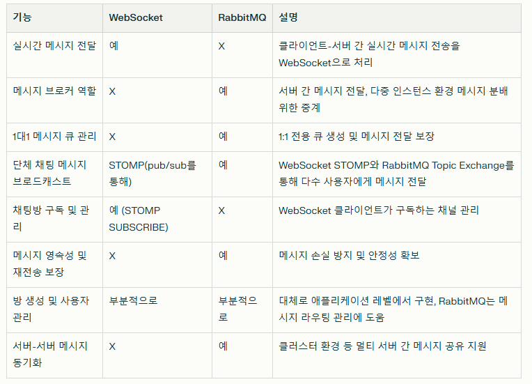 한마디로 중간 통로 역할은 RabbitMQ , 엔드포인트의 역할들은 WebSocket이 담당을 한다고 생각을 하면 된다.