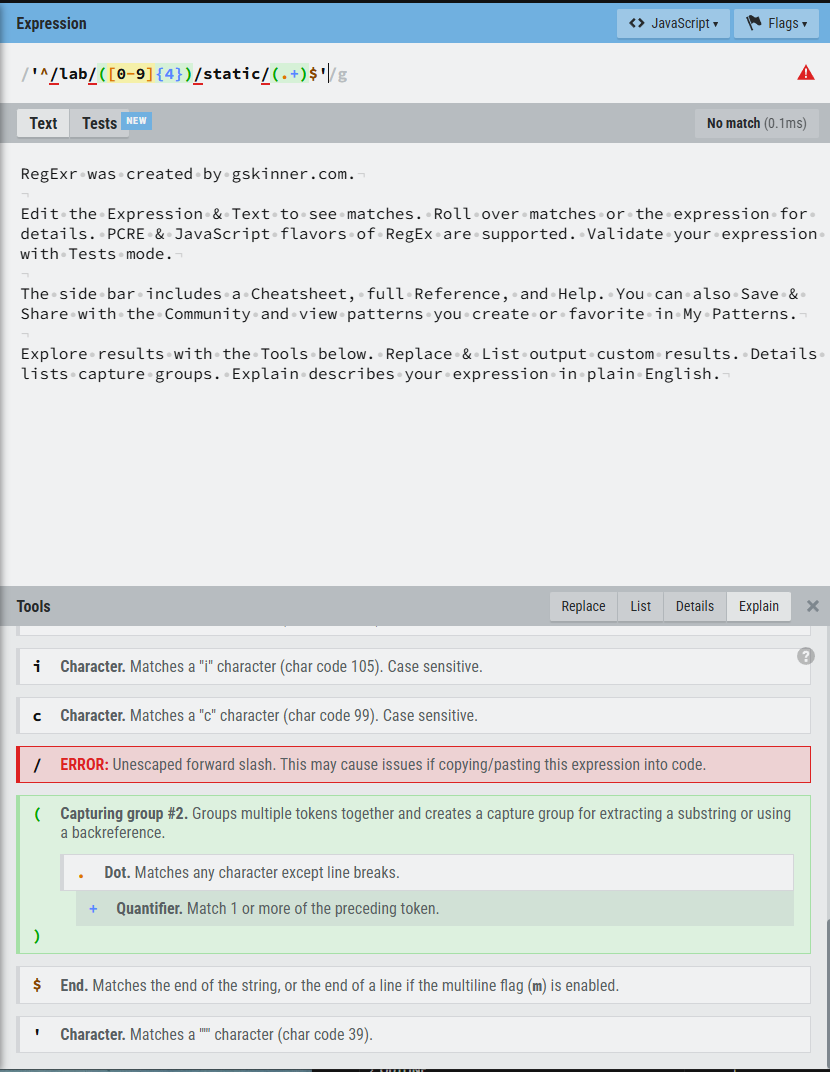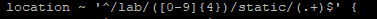 해석을 하면 문자열의 끝을 기점으로 /lab/ 이 있고, 4자리의 숫자가 오고, /static/ 에 임의의 한문자와 앞 문자가 1회 이상 반복한 걸 그룹으로 묶은 뒤 문자열의 끝을 지정하는 형태이다.