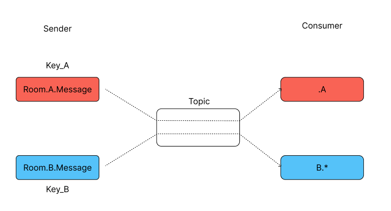 서버 내 메세지 중계 및 분배의 형태는 RabbitMQ를 사용한다. 서버는 클라이언트로부터 받은 메세지를 RabbitMQ의 Exchange에 발행을 한다. 1대 1 상테에서는 Direct Exchange를 사용하고, 단체 채팅방의 경우는 Topic Exchange 방식을 사용하여 메세지 라우팅 및 중계를 진행한다. 기본적으로 Websocket보다 메세지의 영속성, 재전송, 메세지 누락 방지와 같은 신뢰성 보장 기능 활용이 가능하다.