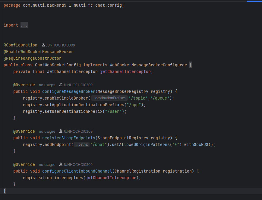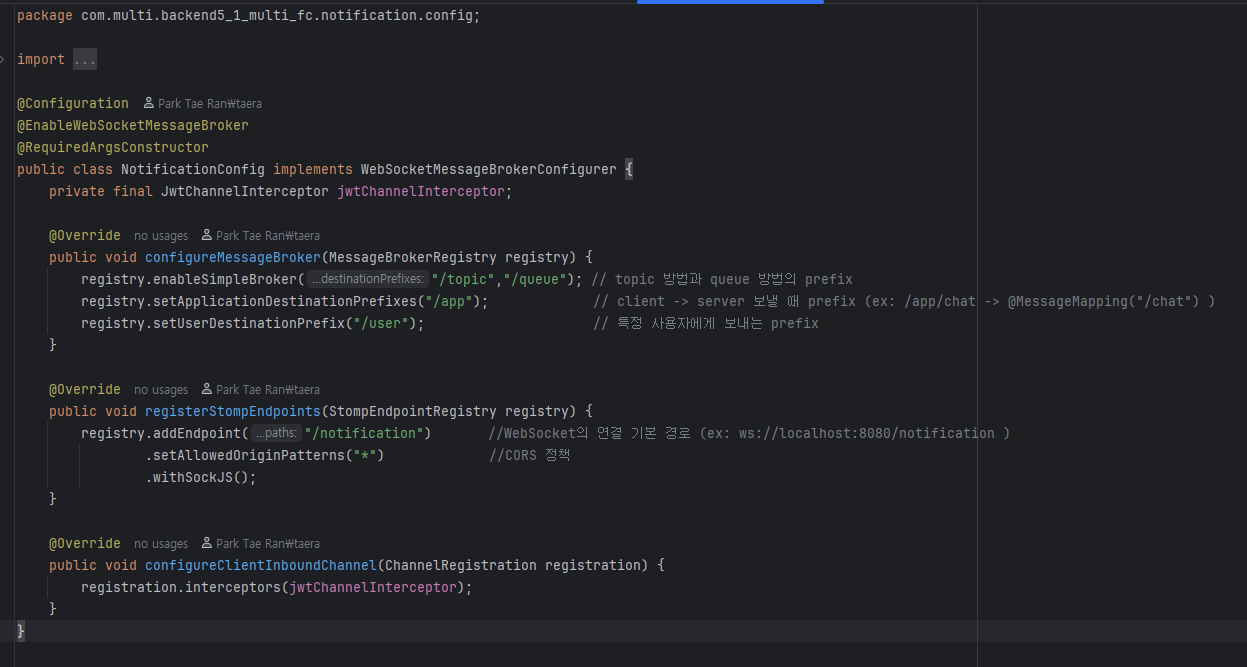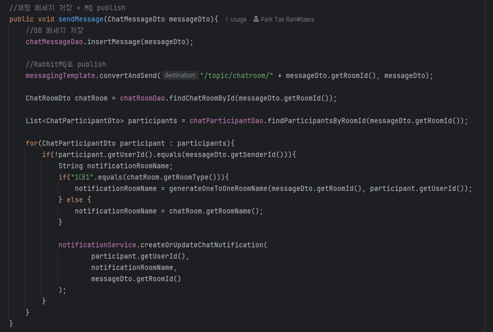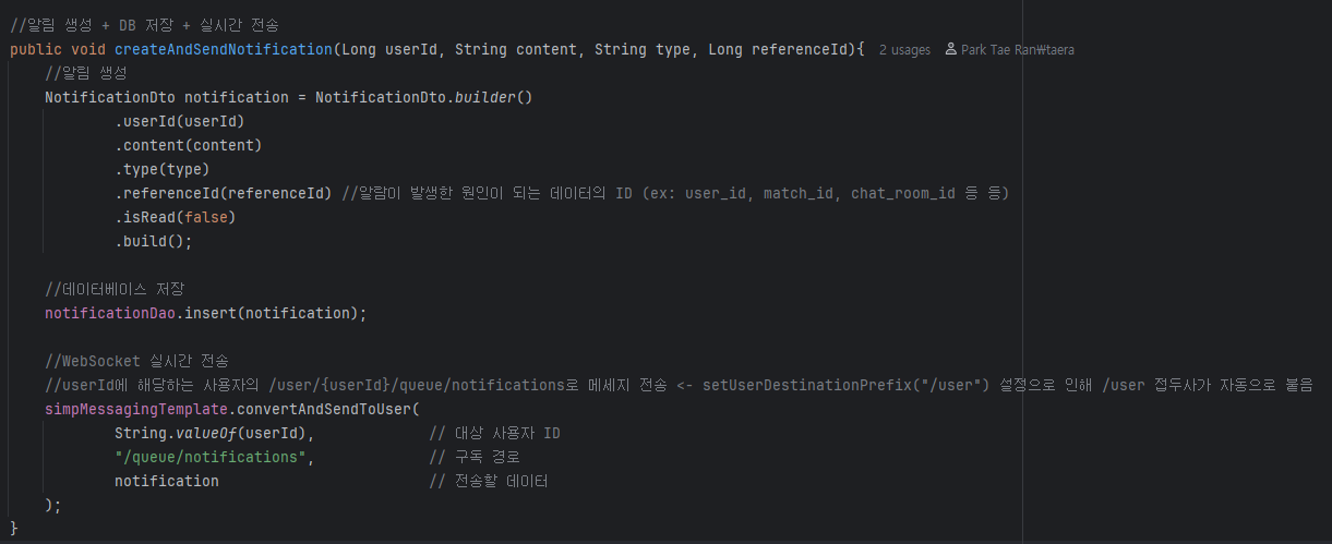 이 쪽은 알림 생성 Service 영역이다. 위쪽은 데이터베이스에 저장하는 코드이고, 그 아래에 있는 코드가 config에서 만든 메소드를 사용한다. 역할은 대상 사용자 ID에게 queue 방식을 사용해서 데이터를 전송하는 것이다.