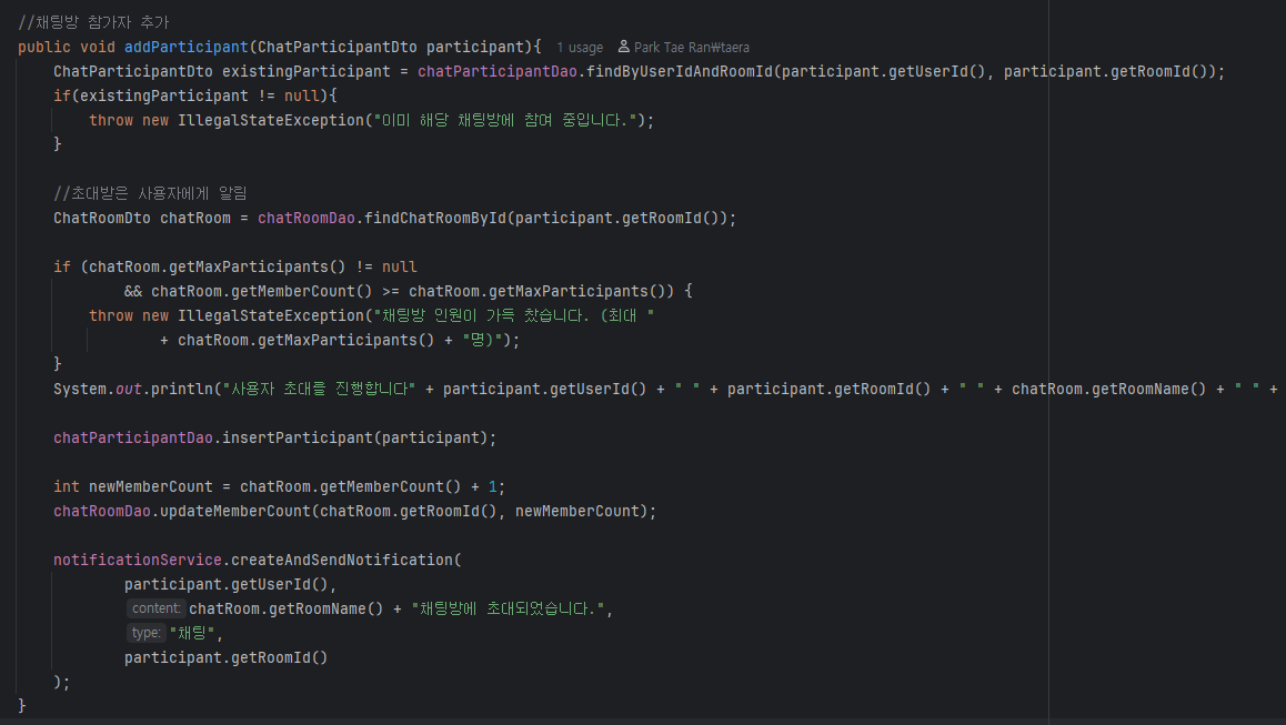 위 코드는 사용자 초대를 할 때 사용하는 기능이다. 예외 처리로 초대한 인원이 이미 채팅방에 존재할 시 throw 처리를 하는 코드이고, 두 번째 예외처리로 모둠 채팅방에는 인원 제한이 존재하는데 제한이 초과되면 throw 예외처리가 된다. 그리고 출력 멤버 조정 및 데이터베이스에 저장한 후에 알림을 보내는 형태이다.