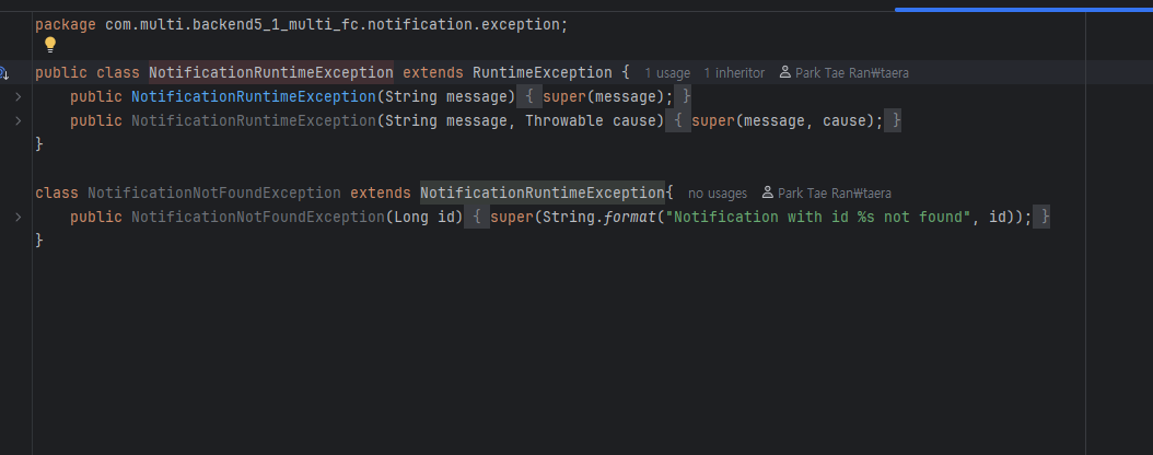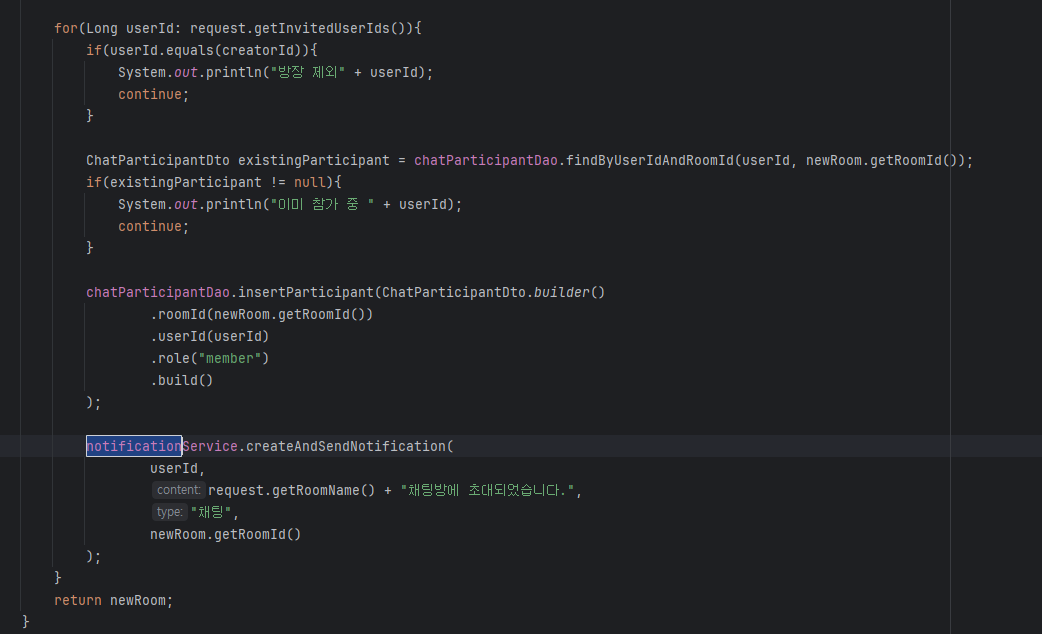 이거는 기존에 있는 방에서 초대를 해서 하는 방식이 아닌, 새로운 채팅방을 생성을 할 때 알림이 가는 형태이다. 위 쪽에는 얼추 방 생성하는 코드와 예외처리 코드가 존재하고, 제일 하단에 있는 부분이 방 초대 알림이 가는 형태이다.